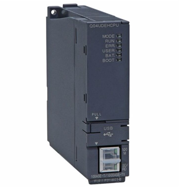 Q04UDEHCPU is a high-performance universal model CPU module belonging to Mitsubishi Electric’s MELSEC-Q Series programmable controller platform. It delivers fast sequence processing with 9.5 ns basic instruction speed, supports up to 4096 local I/O points and 8192 device points, and is equipped with built-in USB and Ethernet interfaces for easy programming, monitoring and network connectivity. The module supports multi-CPU high-speed communication and memory card expansion, making it suitable for mid-range industrial automation applications requiring reliable logic control, fast response and stable networking. It complies with global safety and EMC standards and is designed for use in factory automation, machinery control and system integration environments.